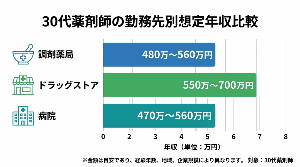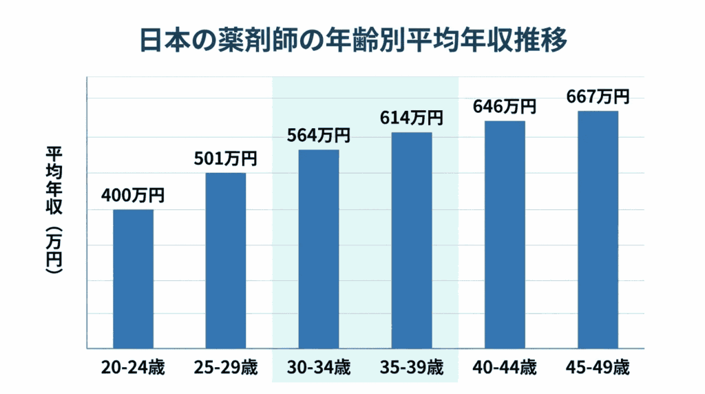 30代薬剤師の年収は、すでに一般平均を100万円以上上回っている水準にあります。