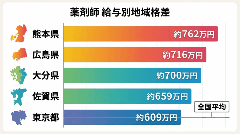 この背景には、都市部では薬剤師の供給が比較的安定しているため給与競争が起きにくい一方、地方では薬剤師不足が深刻で採用のために給与水準を高く設定するケースが多いという事情があります。