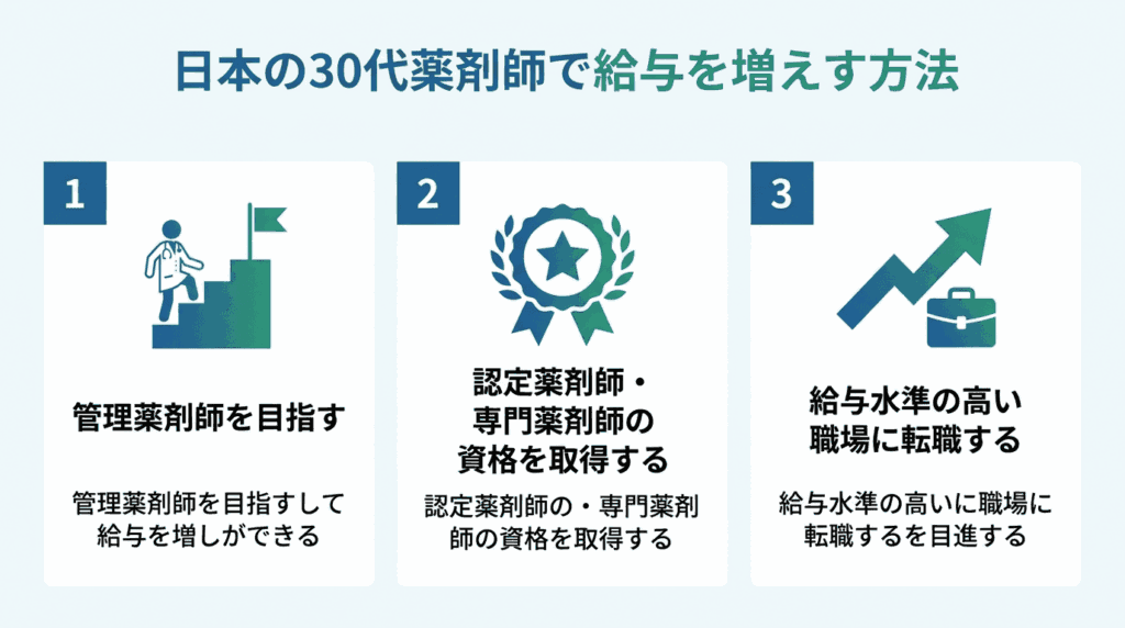 30代は薬剤師としてのキャリアの分岐点とも言われます。ここからの選択が、40代・50代の年収水準に大きく影響します。年収を上げる方法は大きく3つです。