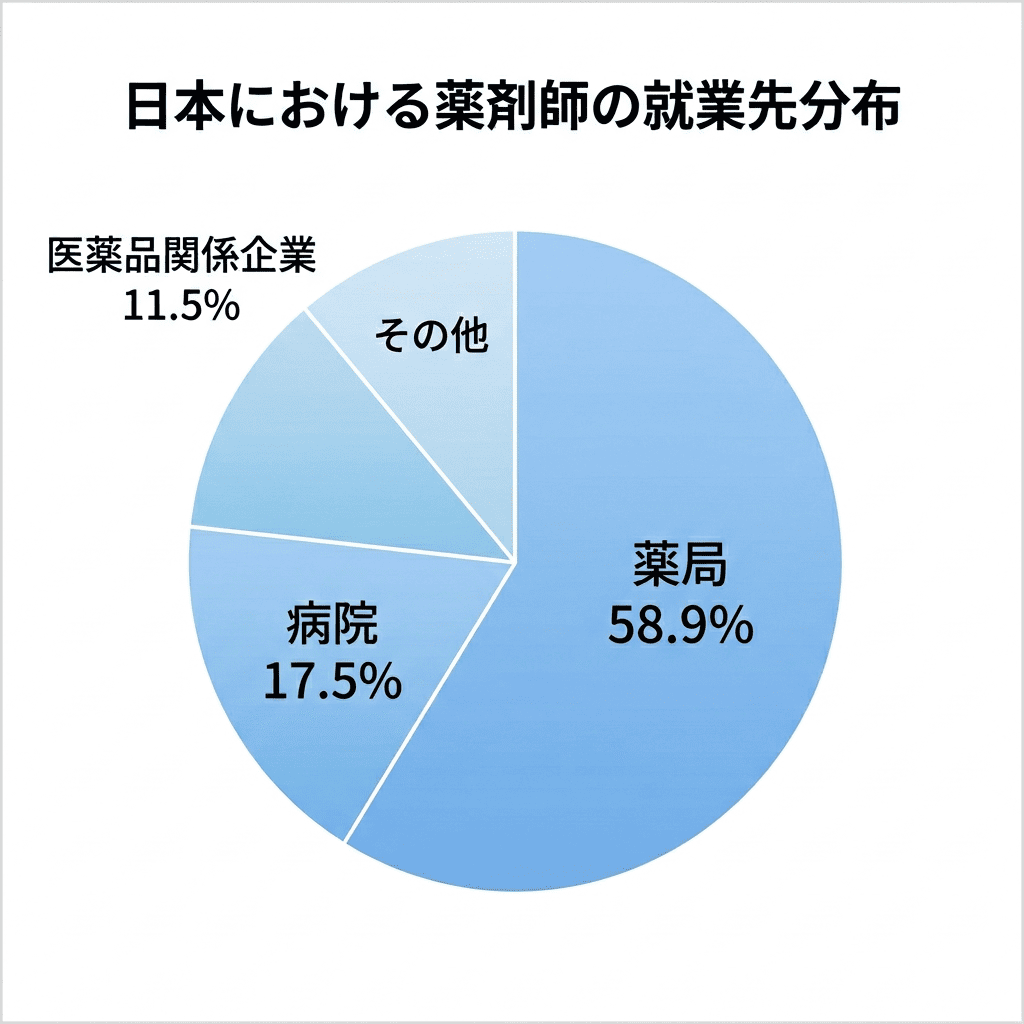 補足: 割合の数字は「現在働いている薬剤師全体の分布」です。毎年の新卒就職先とは異なります。新卒データでは病院を選ぶ割合がやや高くなる傾向があります。