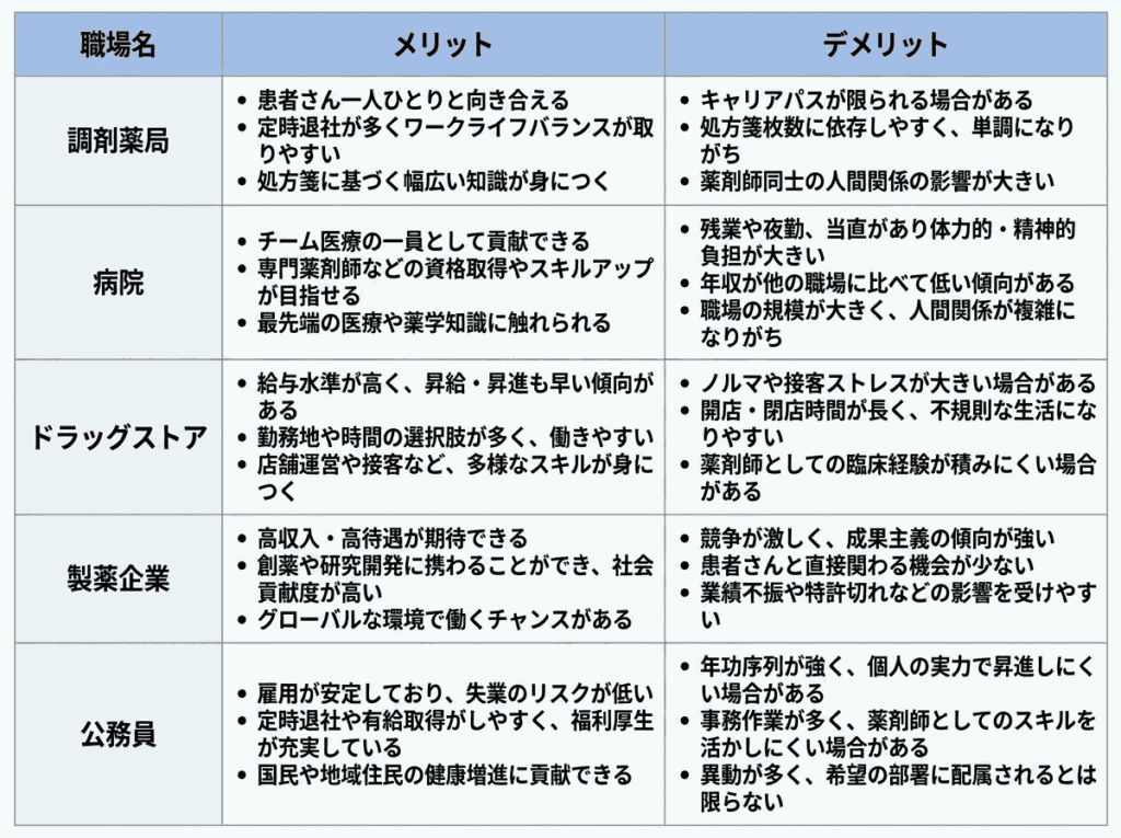 - デメリット: 門前専門の薬局では処方箋の種類が偏りやすく、経験の幅が狭まることがある/少人数職場では人間関係の逃げ場がない場合もある