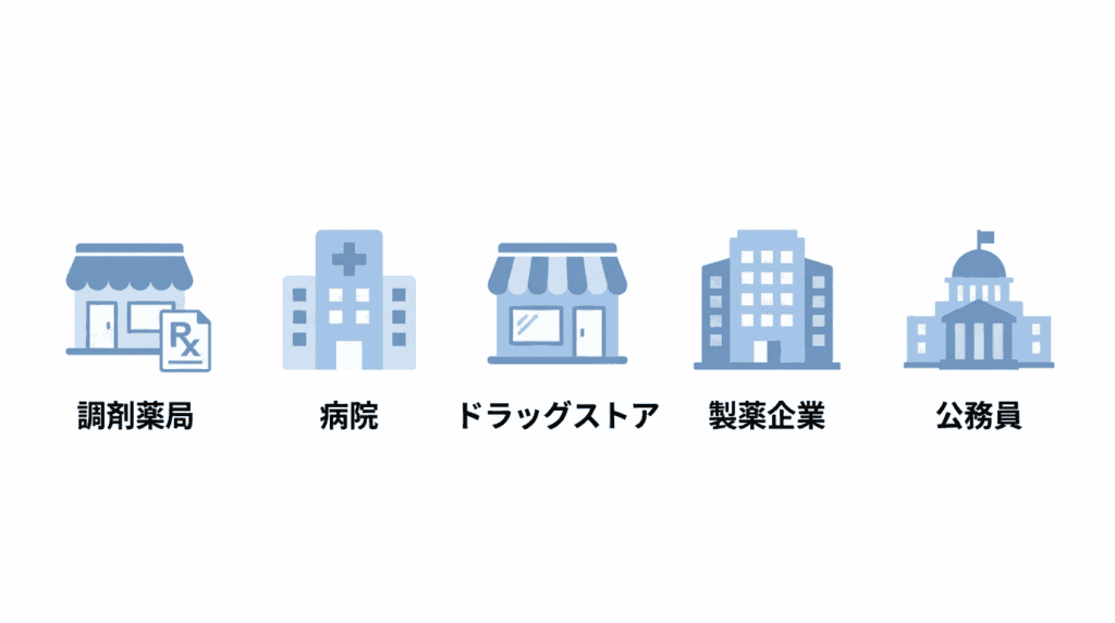 - 製薬企業:高年収・土日休み/競争率が高く調剤経験は積みにくい
