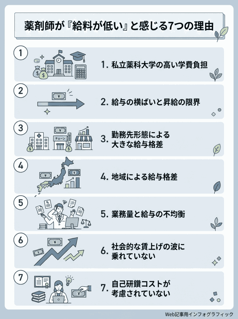 データ上は平均以上の年収であっても、「低い」と感じてしまうのにはそれなりの理由があります。ここでは、現役薬剤師の間でよく語られる不満の背景を整理していきます。