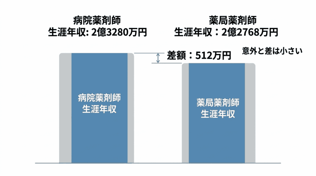 意外にも、生涯年収では病院薬剤師のほうがわずかに上回っています。その差はおよそ512万円にとどまります。