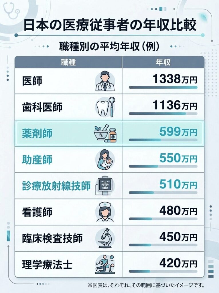 年収の高い・低いは、何と比べるかで印象が大きく変わります。薬剤師の年収を語るうえで避けて通れないのが、同じ医療職との比較です。