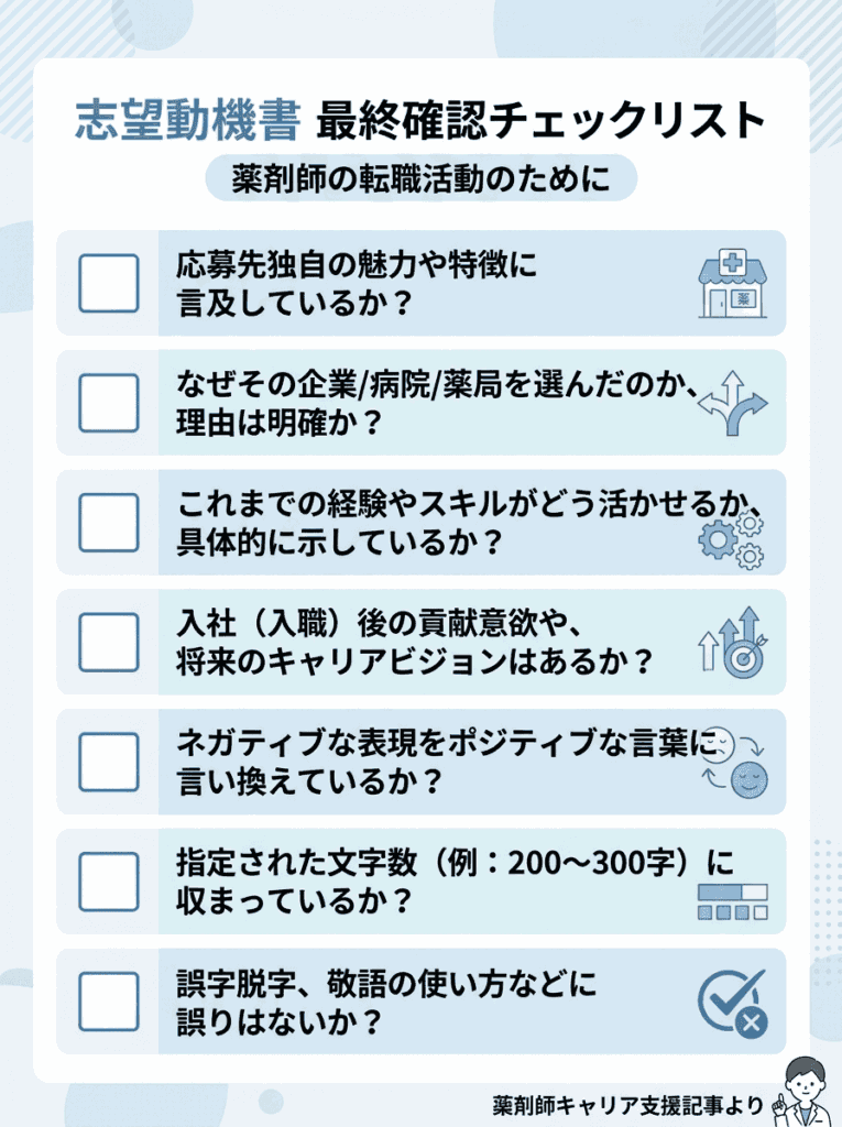 補足: 薬剤師の転職市場では、複数の候補者が同時に応募するケースが多いため、志望動機の質が書類選考の通過率に直結しやすいと言われています。