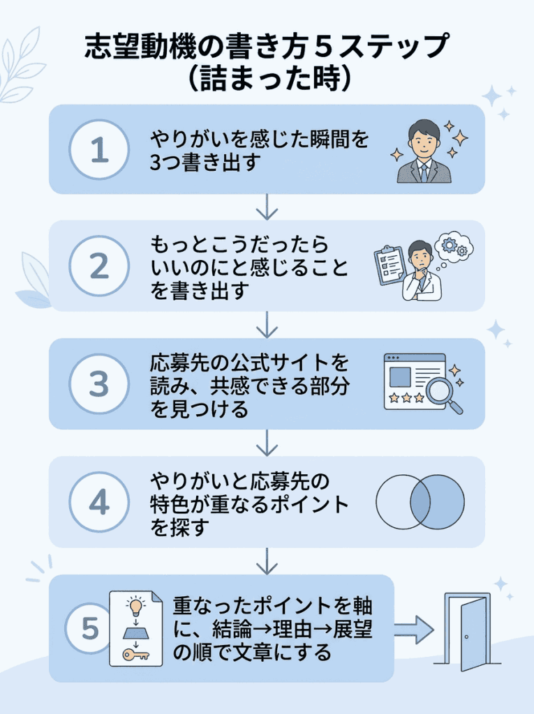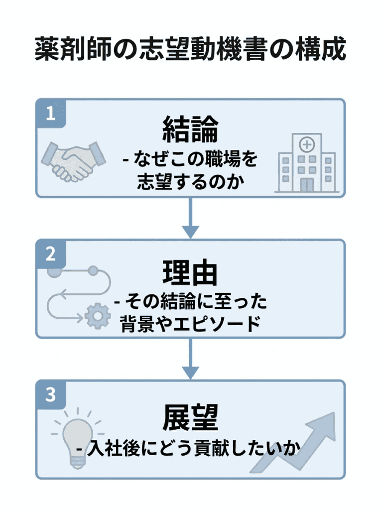 志望動機は次の流れで書くと、読み手に伝わりやすくなります。
