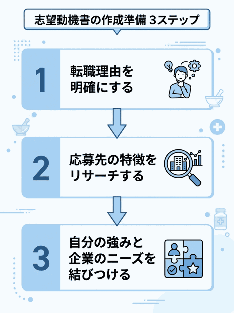 志望動機をいきなり書き始めると、まとまりのない文章になりがちです。書く前に、以下の3つを整理しておくとスムーズに進められます。