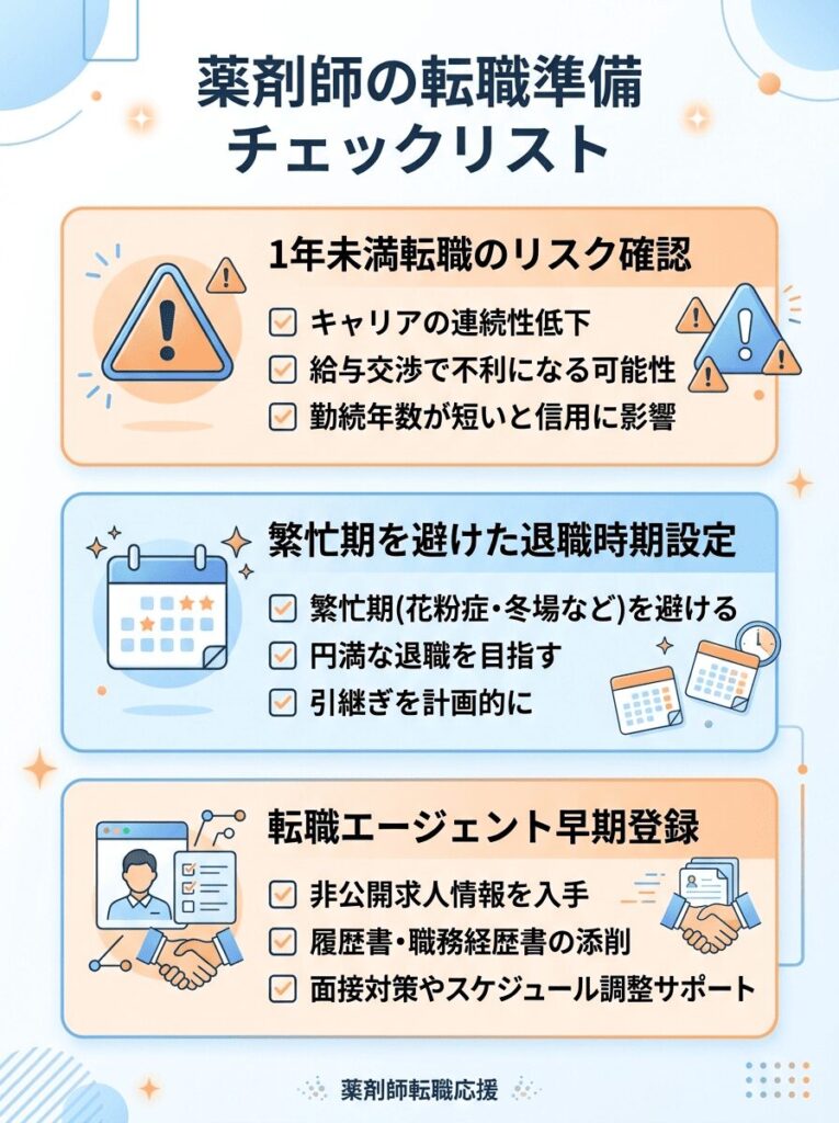 転職時期を決めたら、あとは動くだけ——というわけにはいかないこともあります。行動前に以下の点を整理しておくと、後のトラブルを防げます。