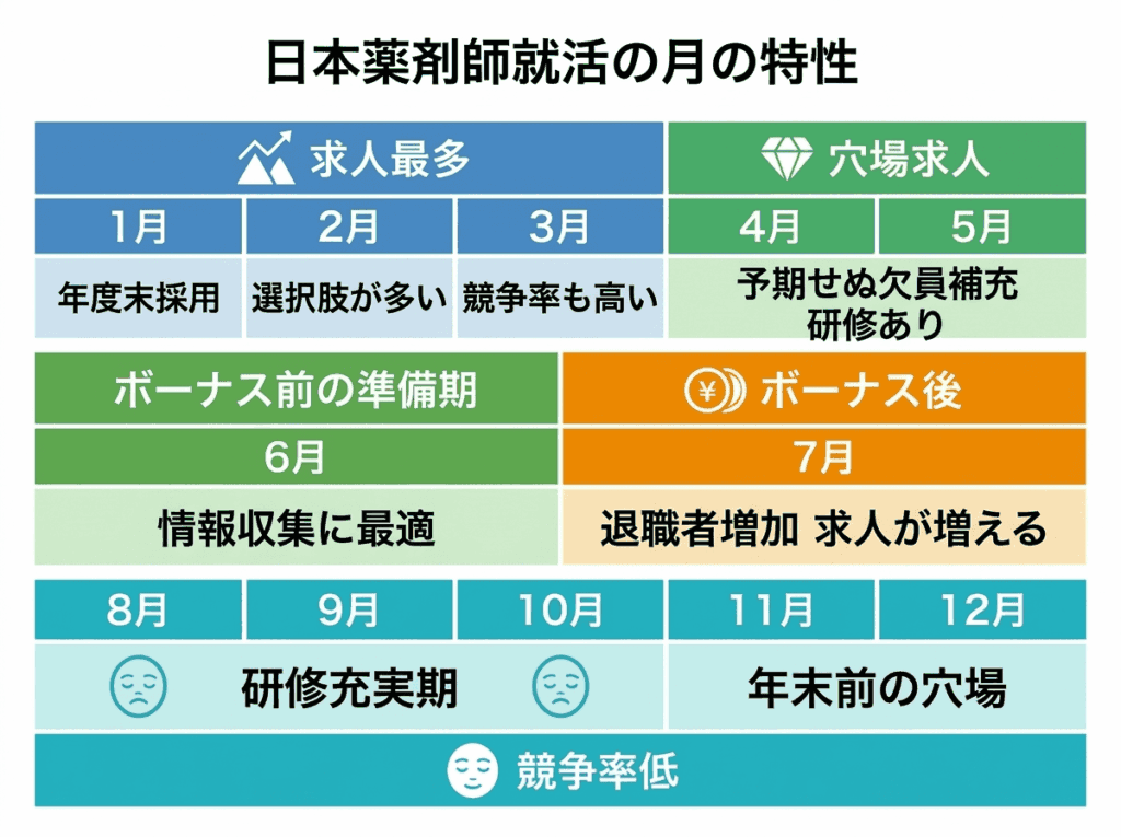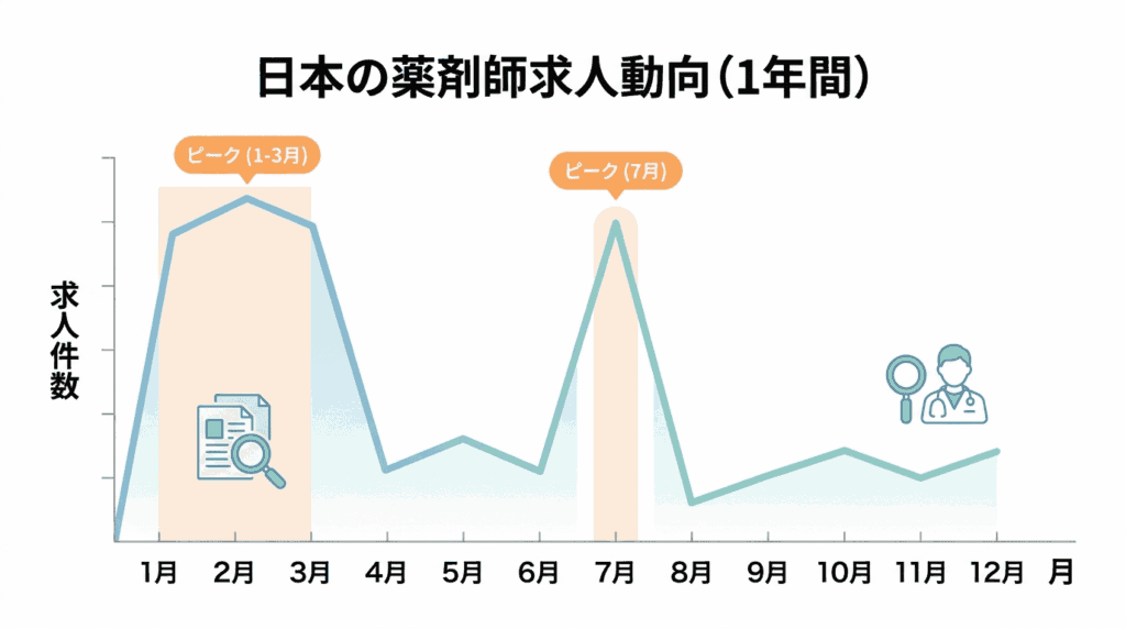 多くの薬局・病院・ドラッグストアでは6月と12月にボーナスが支給されるため、その直後にあたる7月と1月は退職者が増え、結果として求人数も増加する傾向があります。