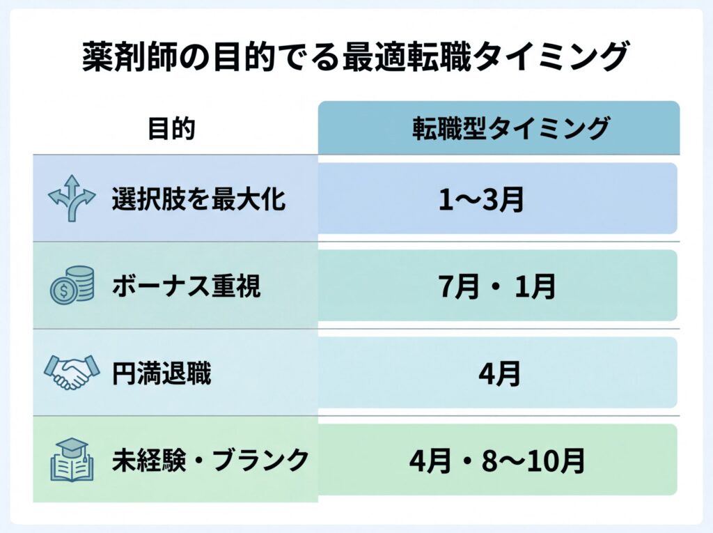 薬剤師の転職に最も適した時期を一言でまとめると、「目的によって正解が異なる」というのが正直なところです。求人の多さを優先するなら1〜3月、ボーナスを受け取ってから動くなら7月か1月、競争率を下げて確実に進めたいなら8〜12月というように、目的に合わせた選択が大切です。